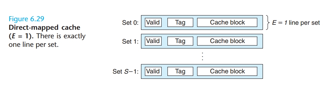 每个组只有一行(E=1)的高速缓存被称为直接映射高速缓存